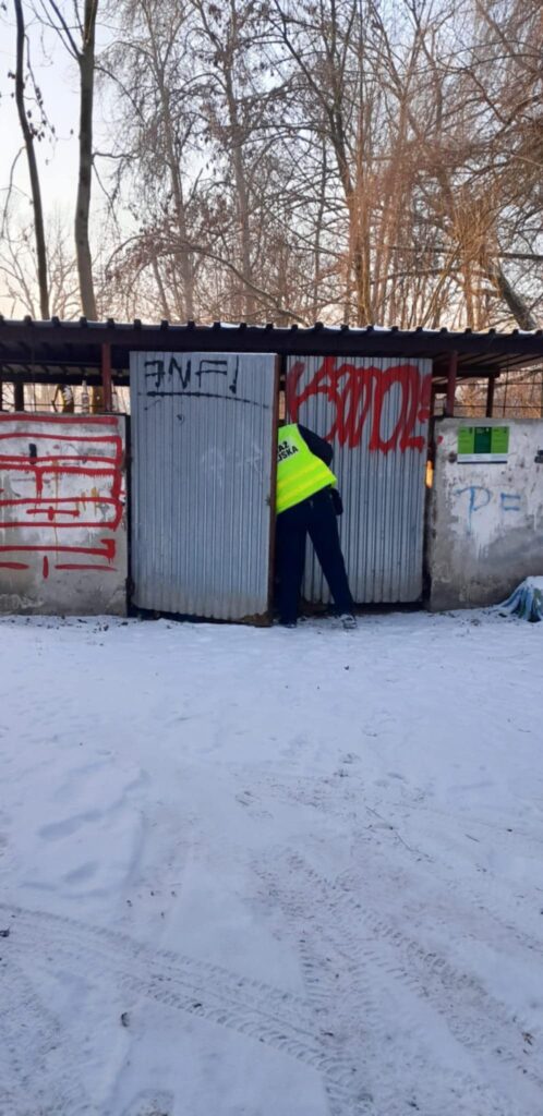 Na zdjęciach widoczni są Strażnicy Miejscy sprawdzający miejsca przebywania osób bezdomnych.